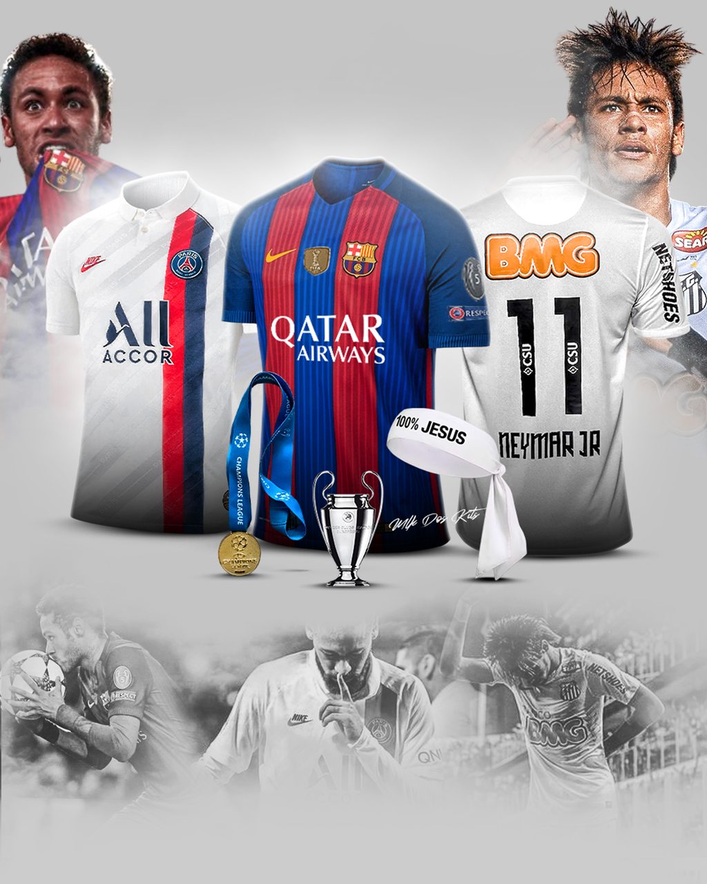Kit "Clubes" Neymar Jr FC Barcelona - Santos - Psg - Medalha Champions - Faixa 100% Jesus - Mini taça